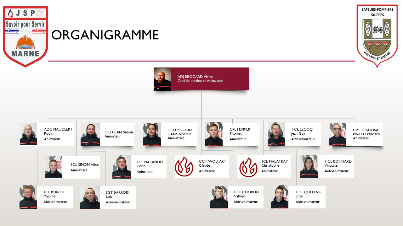 L’équipe pédagogique de la section des jeunes sapeurs-pompiers (JSP) de SUIPPES est composée de sapeurs-pompiers volontaires qui relaient chaque samedi et pour chaque évènements mettant en avant nos JSP du département.